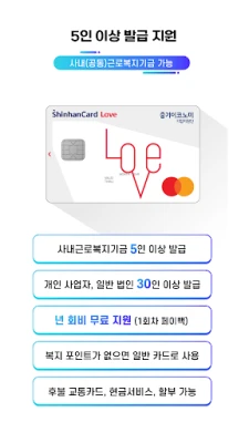 `복지찬스` 전용 복지카드는 국내 최초로 선보이는 사내(공동)근로복지기금 특화 카드입니다. 기업 규모나 업종, 인원수에 제한 없이(5인 이상) 신용카드와 체크카드 중 선택하여 발급 가능하며, 백화점, 마트, 외식, 주유, 테마파크 등에서 역대급 할인 혜택을 제공합니다. 임직원 개인별 복지포인트 배정 즉시 사용 가능하며, 포인트 차감 금액은 기금법인 출연금에서 익월 후불 정산됩니다. 모든 사용 영수증 내역은 자동으로 수집되어 세무기장 및 고용노동부 신고 자료에 정확하게 반영됩니다. PC와 모바일 모두에서 출연금 현황, 직원 관리, 실시간 포인트 지급 및 사용 내역을 손쉽게 확인하고 관리하세요.
