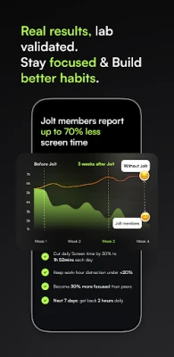 Jolt는 방해 요소를 줄이고 사용 제한을 설정하여 건강한 휴대폰 습관을 돕습니다. 하루 종일 더 나은 집중력을 유지하고, 생산성을 높이며, 기기 사용을 효과적으로 통제하세요. 제한 없이 균형 잡힌 디지털 생활을 경험하세요.